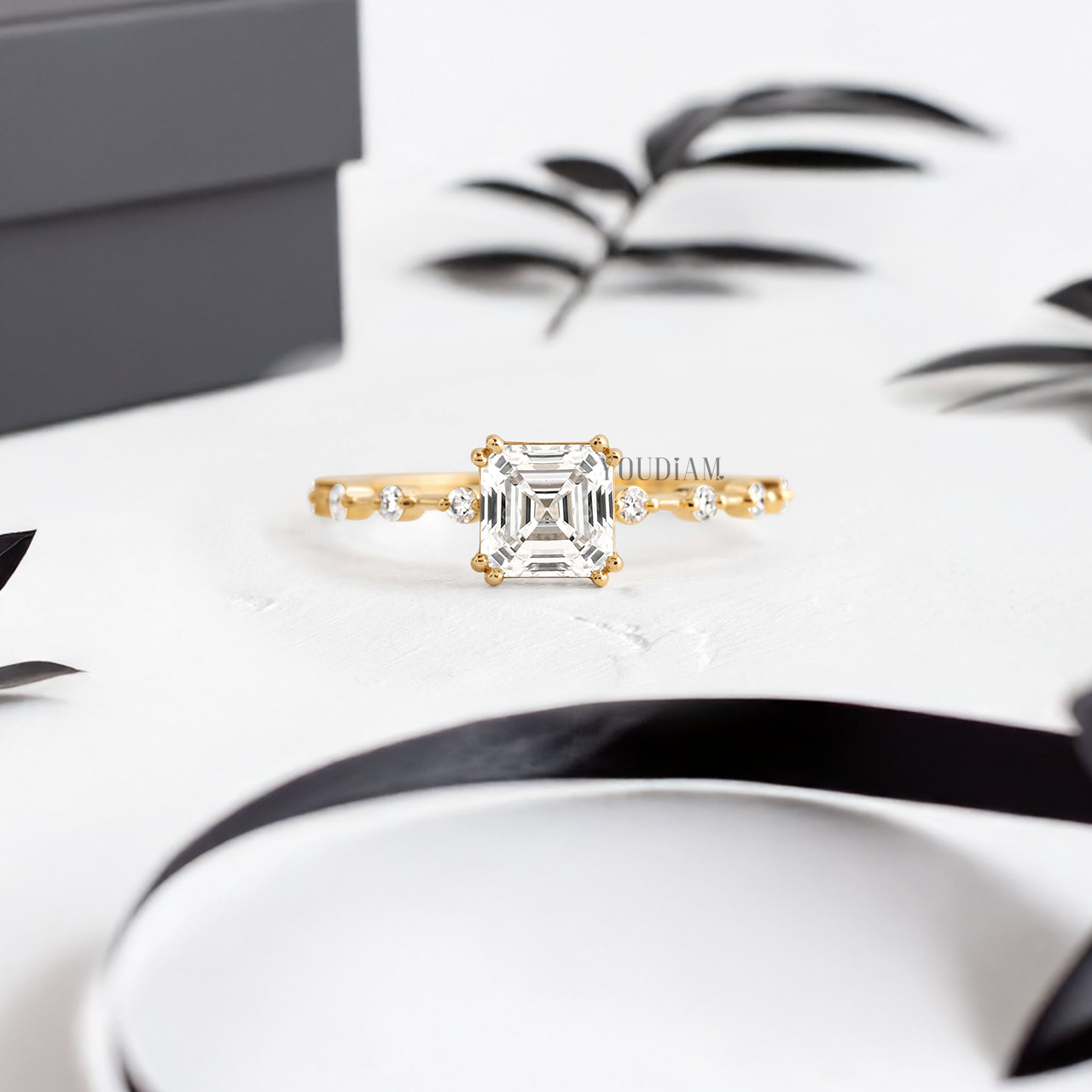 Discover the elegance of our Premium Collection with this stunning Asscher Lab Diamond in Double-Prongs and Distance Diamonds on Band Ring for your engagement or wedding or special occasions in life!