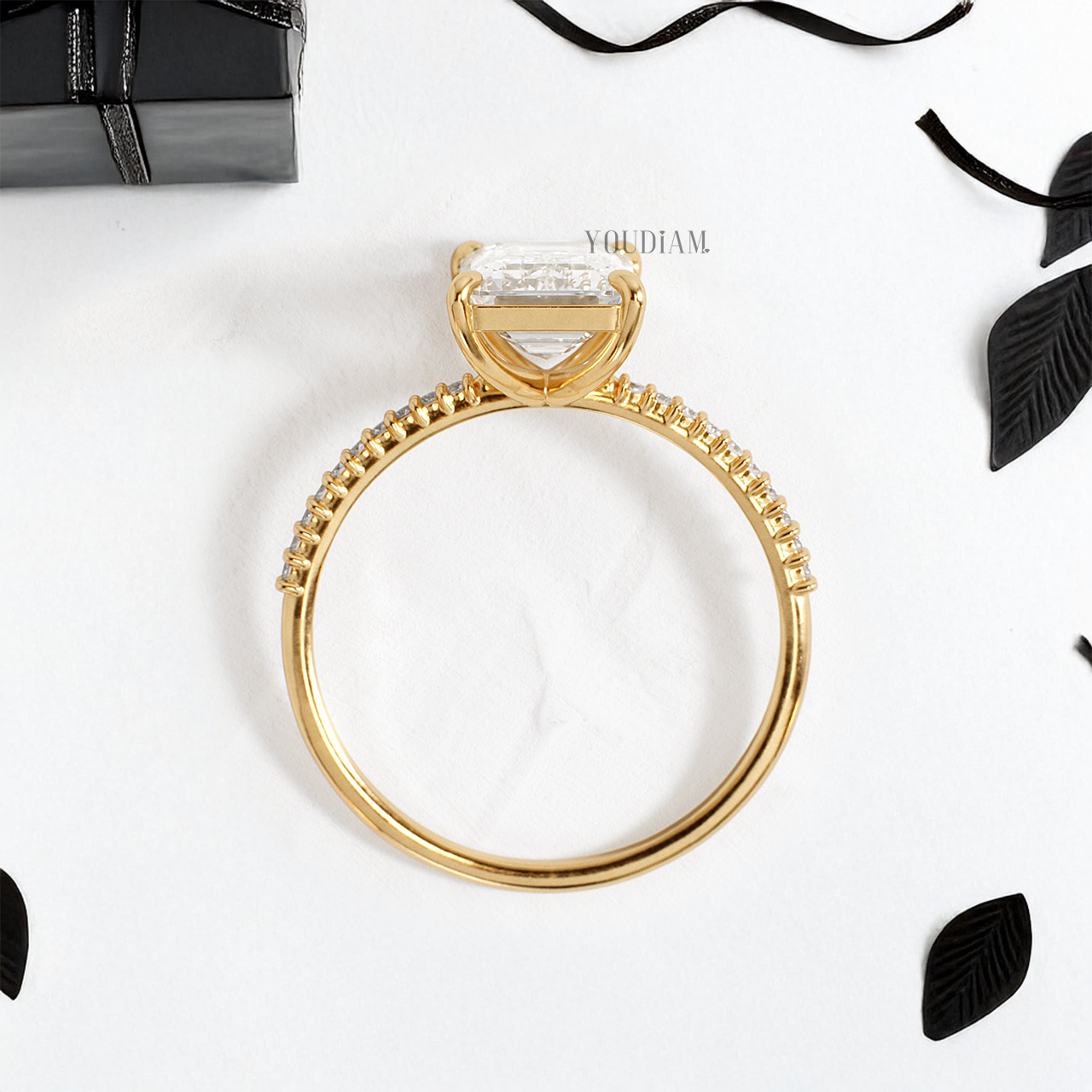 - Stones: Emerald Cut Lab Diamonds and 12 side diamonds